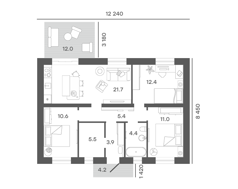 Кухня-гостиная 21,7 м² с выходом на террасу.